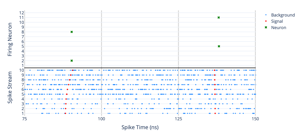 Our idea was to encode the position of detector hits as time-delayed spikes in a neural network. The neurons would then learn to recognize meaningful particle trajectories from noise through a biologically inspired learning rule called spike-timing-dependent plasticity (STDP). This method allows the system to self-organize, reinforcing synapses that contribute to useful patterns and weakening those that do not—all without any supervision.